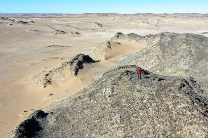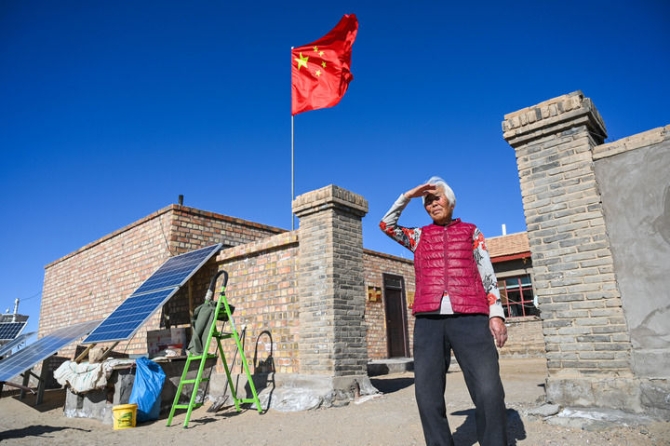 2021年1月,尼瑪老人在戈壁石山上眺望邊境線。 新華社記者 連振 攝