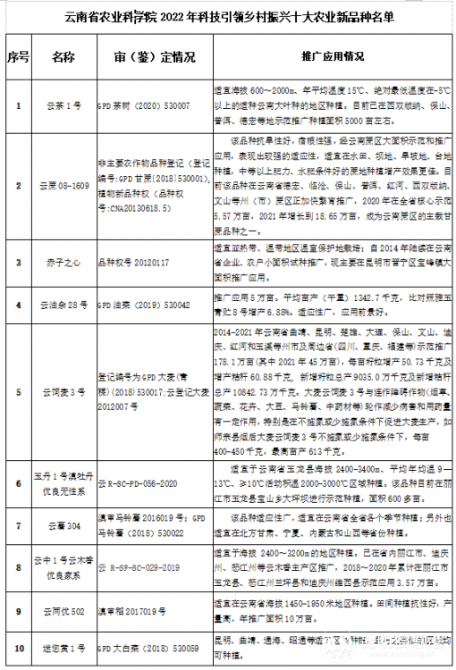 2022年,云南省農(nóng)業(yè)科學(xué)院聚焦糧、花、茶、蔗、菜、果、油等特色優(yōu)勢(shì)作物,加速科技成果轉(zhuǎn)化,篩選出云茶1號(hào)、云蔗08-1609、赤子之心、云油雜28號(hào)、云飼麥3號(hào)、玉丹1號(hào)、云薯304、云中1號(hào)、云兩優(yōu)502、迷您黃1號(hào)十大高產(chǎn)優(yōu)質(zhì)品種。云南茶園化肥農(nóng)藥減施增效技術(shù)、低緯高原山地玉米化肥農(nóng)藥減施增效綜合技術(shù)、丘陵山地甘蔗機(jī)械化種植技術(shù)、高山杜鵑年宵盆花生產(chǎn)技術(shù)、旱地鮮食豌豆免耕套作直播高效生產(chǎn)技術(shù)、油菜化肥農(nóng)藥減施技術(shù)、云南獼猴桃綠色高效栽培關(guān)鍵技術(shù)、農(nóng)作物及其產(chǎn)品轉(zhuǎn)基因成分檢測(cè)技術(shù)、家蠶血液型膿病防控技術(shù)、一種低成本冷萃凍干咖啡加工技術(shù)十大綠色高效栽培技術(shù)供全省進(jìn)行推廣應(yīng)用。