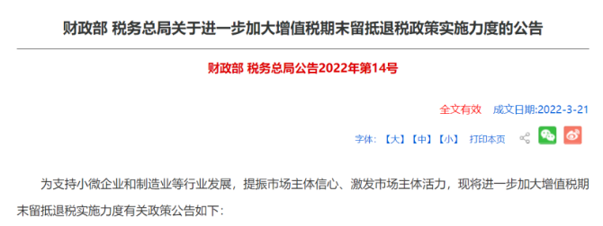 4月1日起,我國(guó)將實(shí)施大規(guī)模留抵退稅政策。