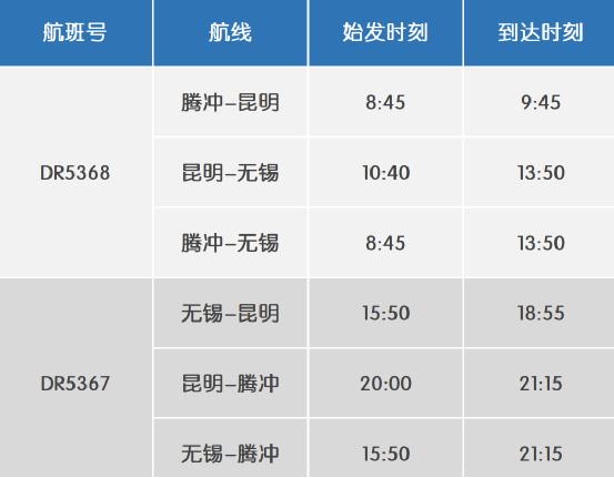另外,3月29日,蘇南瑞麗航空新開(kāi)“騰沖=昆明=無(wú)錫”和“昆明=芒市=成都天府”航線?!膀v沖=昆明=無(wú)錫”航班班期計(jì)劃為每天執(zhí)飛,航班信息如下: