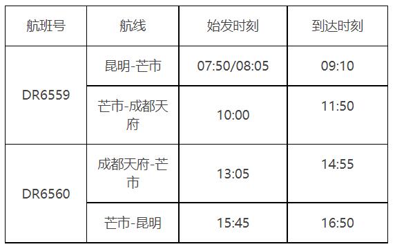 “昆明=芒市=成都天府”航班班期計(jì)劃為每周二、四、六執(zhí)飛,航班信息如下: