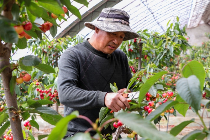 在花果飄香農(nóng)業(yè)合作社,張紹民在打理櫻桃樹。(受訪者供圖)