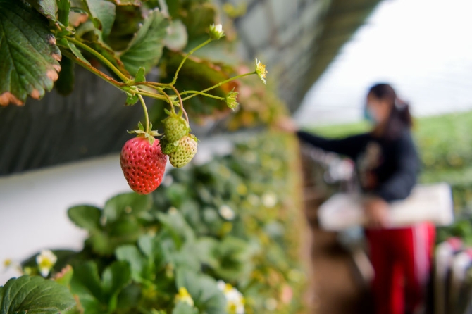 在百鮮現(xiàn)代農(nóng)業(yè)園區(qū),工人在采摘草莓。新華社記者李志鵬 攝