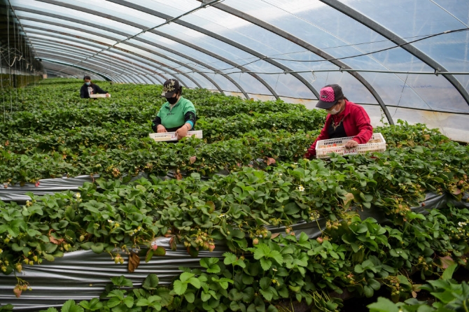 在烏蘭計(jì)二村200多公里外的呼和浩特市新城區(qū)討思浩村,百鮮現(xiàn)代農(nóng)業(yè)園區(qū)里一座座大棚排列整齊。棚內(nèi),紅紅的草莓在綠葉襯托下十分顯眼,工人王愛云手拿塑料筐挨個(gè)采摘,臉上洋溢著收獲的喜悅。