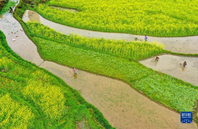 3月30日,貴州省赤水市復(fù)興鎮(zhèn)太和村的農(nóng)民在田間勞作(無(wú)人機(jī)照片)。清明將至,各地農(nóng)民忙著春耕勞作,田間地頭一派忙碌景象。新華社發(fā)(王長(zhǎng)育 攝)