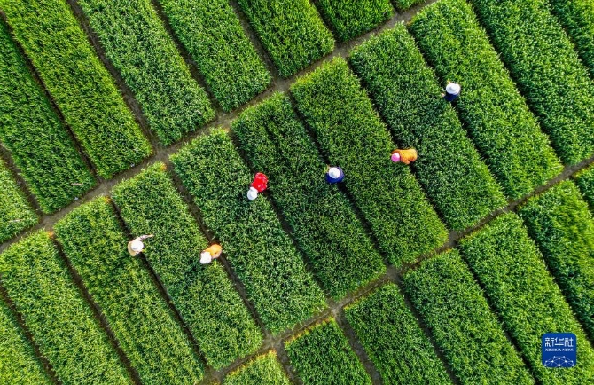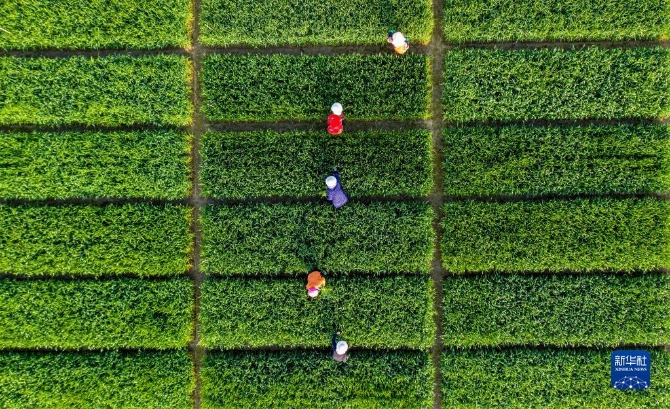 3月30日,在安徽省合肥市廬江縣白湖鎮(zhèn)省級(jí)現(xiàn)代農(nóng)業(yè)示范區(qū)育種基地,農(nóng)民在小麥育種田清除雜草(無(wú)人機(jī)照片)。清明將至,各地農(nóng)民忙著春耕勞作,田間地頭一派忙碌景象。新華社發(fā)(左學(xué)長(zhǎng) 攝)