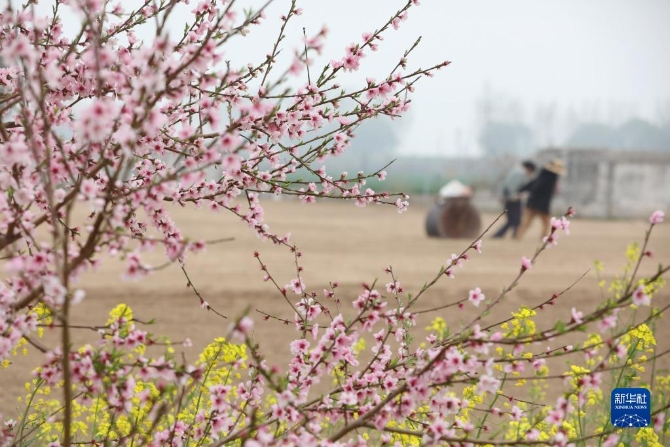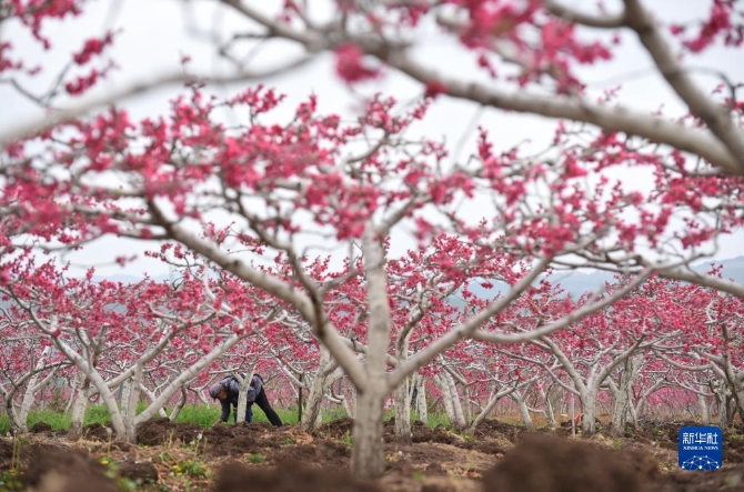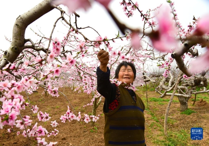3月30日,山東省棗莊市山亭區(qū)水泉鎮(zhèn)東堌城村婦女為盛花期的桃樹(shù)人工疏花。清明將至,各地農(nóng)民忙著春耕勞作,田間地頭一派忙碌景象。新華社發(fā)(劉明祥 攝)