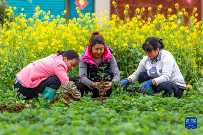 3月30日,村民在貴州省黔西市杜鵑街道大興社區(qū)草莓基地進(jìn)行種苗移栽。清明將至,各地農(nóng)民忙著春耕勞作,田間地頭一派忙碌景象。新華社發(fā)(范暉 攝)