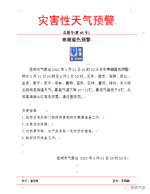 昆明信息港訊 昆明市氣象臺(tái)3月31日16時(shí)30分發(fā)布寒潮藍(lán)色預(yù)警,預(yù)計(jì)3月31日20時(shí)至4月2日20時(shí),五華、盤龍、官渡、西山、呈貢、晉寧、安寧、尋甸、嵩明、宜良、石林、富民、祿勸、東川將出現(xiàn)明顯降溫天氣,最高氣溫下降10~12℃,最低氣溫低于5℃,北部高海拔山區(qū)有雨夾雪。