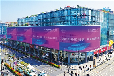 杭州市上城區(qū)延安路亞洲最大LED大屏“西湖天幕”亮相杭州。栩栩如生的吉祥物“江南憶”組合、亞運(yùn)宣傳海報(bào)和動畫視頻等內(nèi)容營造出濃厚的亞運(yùn)氛圍,令市民及游客大飽眼福。洪 亮攝(中經(jīng)視覺)