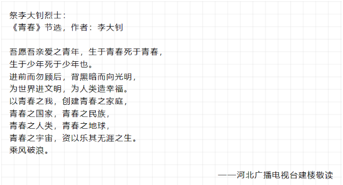 李大釗創(chuàng)建青春中華的理想經(jīng)久不衰,如今青春已被演繹成歌,被當(dāng)代青年傳唱。李大釗一生追求革命真理,追求民族獨(dú)立和人民解放,始終把個人生死置之度外。他生前曾撰寫名聯(lián)“鐵肩擔(dān)道義,妙手著文章”。