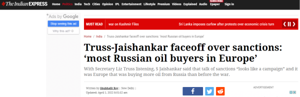 據(jù)《印度快報(bào)》、印度《明特報(bào)》等多家印媒報(bào)道,當(dāng)?shù)貢r(shí)間周四(3月31日),到訪印度的英國(guó)外交大臣特拉斯與印度外長(zhǎng)蘇杰生就購(gòu)買俄石油問題進(jìn)行了一場(chǎng)“尖銳交鋒”。在特拉斯用英國(guó)立場(chǎng)對(duì)印度旁敲側(cè)擊后,蘇杰生稱西方對(duì)俄的一系列制裁就像一場(chǎng)“運(yùn)動(dòng)”,反駁道:歐洲才是俄石油的大買家、甚至比俄烏開戰(zhàn)前買的還多。