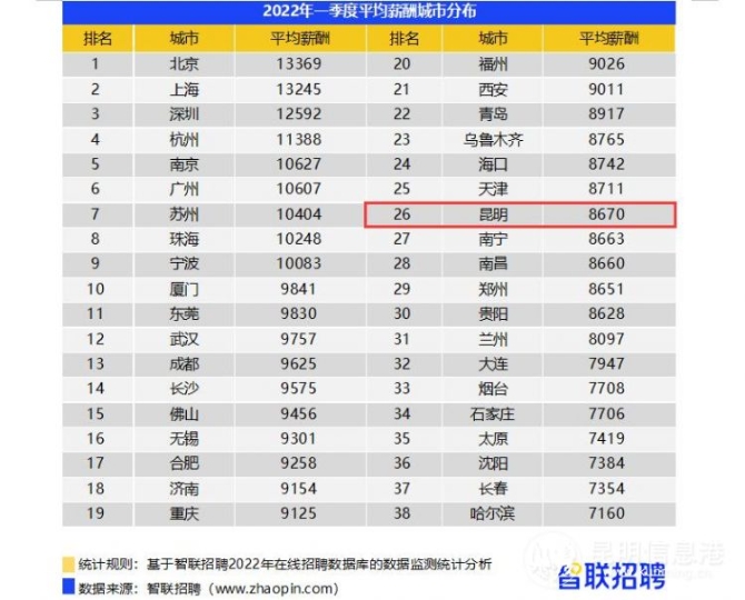 智聯(lián)招聘在線數(shù)據(jù)顯示,2022年一季度全國38個核心城市的平均招聘薪酬為10014元/月,環(huán)比下降1%,但較去年同期的9059元/月上升10.5%。其中,北京(13369元/月)、上海(13245元/月)、深圳(12592元/月)和杭州(11388元/月)四地的月薪仍然處于領(lǐng)先地位,長三角的南京、蘇州、寧波和珠三角的廣州、珠海的平均薪酬也過萬元,具備較高人才吸引力。與上季度相比,南京的平均招聘薪資提升0.7%,達到10627元/月,超越廣州的10607/月上升至第五位。昆明以8670元/月的平均招聘薪酬,位列全國38個核心城市的第26位。