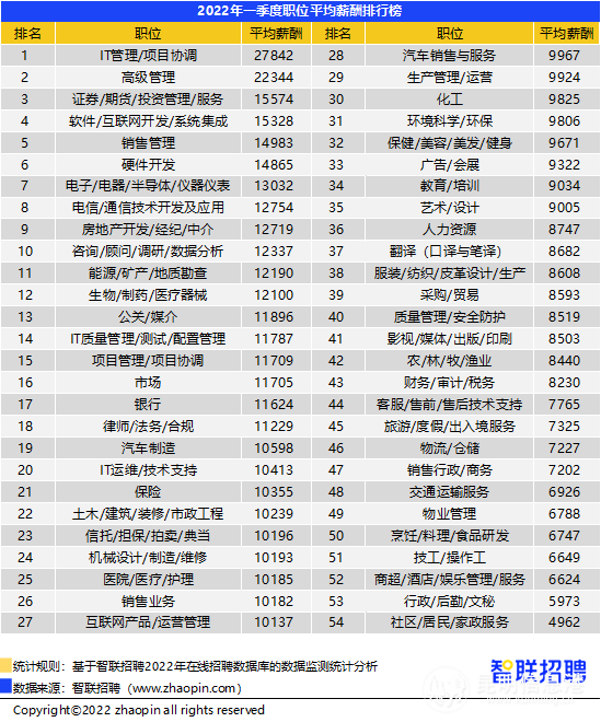 從職業(yè)來看,管理崗薪酬依然位居榜首,汽車制造崗位薪酬升至10598元/月,房產(chǎn)中介招聘月薪達到12719元。與互聯(lián)網(wǎng)行業(yè)薪資下降對應(yīng),IT管理崗一季度招聘薪酬環(huán)比下降4.1%,在所有職業(yè)中降幅最大,互聯(lián)網(wǎng)產(chǎn)品/運營管理崗薪資也下降2.6%。