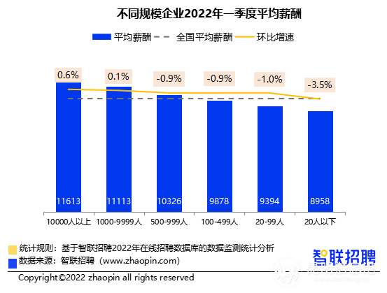 一季度不同規(guī)模企業(yè)平均招聘薪資差距擴大,其中,規(guī)模在10000人以上的超大型企業(yè)的薪資水平仍然最為可觀,月均工資達11613元,環(huán)比增速為0.6%。1000-9999人的大型企業(yè)的薪資略高于上季度,達到11113元/月。中型企業(yè)薪酬與上季度相比略有下降,500-999人和100-499人的企業(yè)薪酬環(huán)比分別下降0.9%。20-99人的小型企業(yè)薪資低于全國平均水平,且較上季度下降1%至9394元/月。20人以下微型企業(yè)薪酬更下降3.5%,跌至8958元/月。