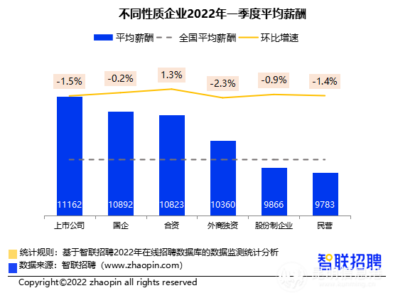 從企業(yè)性質(zhì)看,一季度上市公司繼續(xù)以11162元/月的平均招聘薪酬穩(wěn)居第一。國企以10892元/月排名第二,與上季度基本相當(dāng)。合資企業(yè)平均招聘薪酬較上季度提升1.3%,排在第三位。外商獨資企業(yè)的平均招聘薪酬則環(huán)比則下降2.3%,不過仍高于全國平均水平。股份制企業(yè)和民營企業(yè)的薪酬水平分別為9866元/月和9783元/,低于全國平均薪酬,且低于上季度水平。