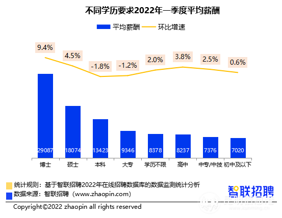 從學(xué)歷要求看,一季度博士的平均招聘薪酬最高,為29087元/月。碩士次之,為18074元/月。本科為13423元,大專為9346元/月,高中為8237元/月,要求初中及以下學(xué)歷的崗位平均招聘薪酬為7020元/月。