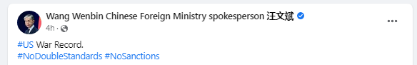 汪文斌發(fā)布的這張寫有“美國戰(zhàn)爭記錄”的圖片顯示,1989年到2017年期間,美國發(fā)動(參與或挑起)了10場戰(zhàn)爭,導(dǎo)致600萬人被殺害。這些戰(zhàn)爭包括伊拉克戰(zhàn)爭,阿富汗戰(zhàn)爭,利比亞戰(zhàn)爭,巴拿馬戰(zhàn)爭,索馬里戰(zhàn)爭,蘇丹戰(zhàn)爭,敘利亞戰(zhàn)爭,海灣戰(zhàn)爭,南斯拉夫戰(zhàn)爭,也門戰(zhàn)爭。列舉這些殘酷事實(shí)后,圖片底部寫道,“他們得到了什么……0制裁”。而這條帖子的配文中,同樣寫有“美國戰(zhàn)爭記錄”“沒有雙重標(biāo)準(zhǔn)”“沒有制裁”,以此發(fā)起警示?!?/p>