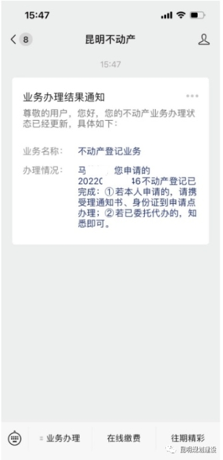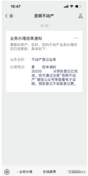 第二步:申請辦理登記后,“昆明不動產(chǎn)”微信公眾號會向您推送以下信息