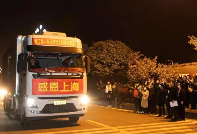 10輛車,車頭貼著“感恩上?!彼膫€(gè)大字,車側(cè)還貼著“同飲一江水,感恩上海人”等感謝上海的句子……