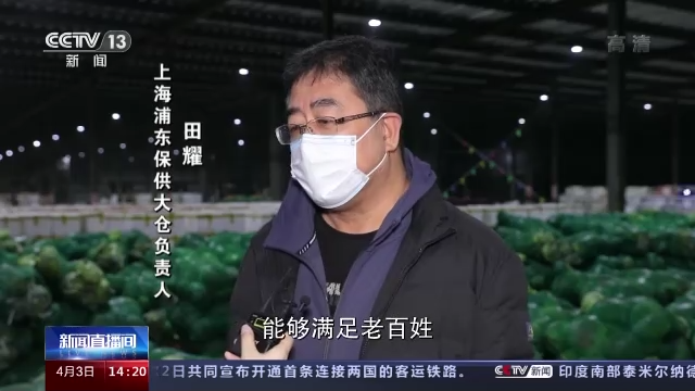 上海浦東保供大倉負(fù)責(zé)人 田耀:這個(gè)大倉整體面積是12000多平方米,整體的存儲(chǔ)量可以達(dá)到1500噸左右。這個(gè)倉我們主要保證浦東(封控)這一段時(shí)間內(nèi),能夠滿足老百姓日常農(nóng)產(chǎn)品的基本需求。整個(gè)儲(chǔ)存了400多噸的貨,大的20噸到30噸的卡車川流不息沒停過。