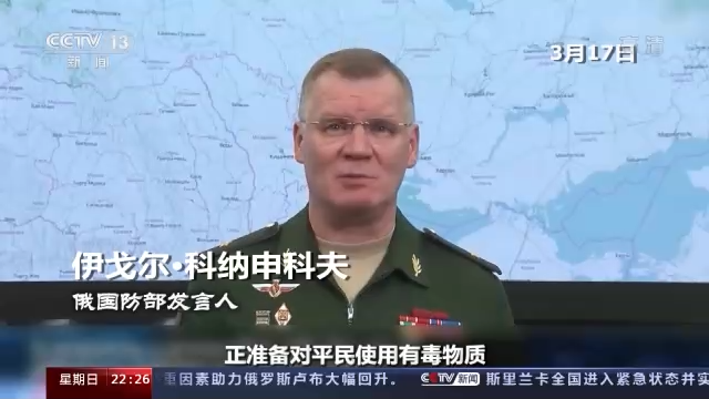 俄國防部發(fā)言人 伊戈爾·科納申科夫:我們有充分的證據(jù)表明,在西方支持下,烏克蘭安全部門正準(zhǔn)備對平民使用有毒物質(zhì)。這么做的目的是指責(zé)俄羅斯對烏克蘭人民使用化學(xué)武器。我想正式澄清一點,參與此次特別軍事行動的俄軍,不會也不可能使用化學(xué)武器。我們不像美國,俄羅斯早就履行國際義務(wù),徹底銷毀了化學(xué)武器庫。
