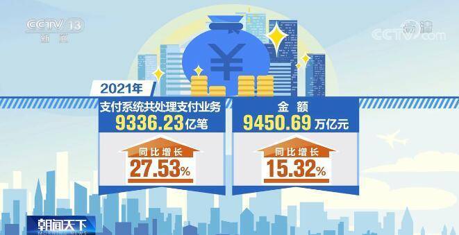 2021年,支付系統(tǒng)共處理支付業(yè)務(wù)9336.23億筆,金額9450.69萬億元,同比分別增長27.53%和15.32%。