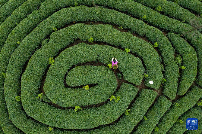 3月30日,茶農(nóng)在四川省雅安市蒙頂山上的茶園采摘茶青(無人機(jī)照片)。新華社記者 沈伯韓 攝