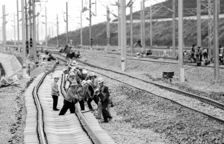 4月10日,在紅河州蒙自市彌蒙高鐵紅河站,工人對(duì)鐵軌進(jìn)行維護(hù)。新華社發(fā) 王俞 攝