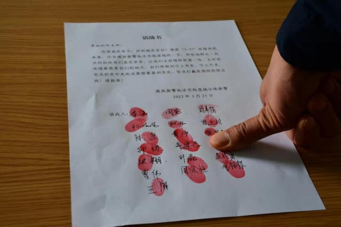 “我們鄭重請(qǐng)求,在疫情防控危急時(shí)刻,作為一名共產(chǎn)黨員,我自愿申請(qǐng)加入到抗疫戰(zhàn)斗中去,為黨和人民群眾貢獻(xiàn)自己的力量?!泵鎸?duì)疫情,民警金銘輝等數(shù)十人主動(dòng)請(qǐng)纓寫下請(qǐng)戰(zhàn)書,按下鮮紅手印,強(qiáng)烈要求申請(qǐng)到抗“疫”一線去,一封封印著紅手印的請(qǐng)戰(zhàn)書,是共產(chǎn)黨員的無(wú)所畏懼和忠誠(chéng)擔(dān)當(dāng)。