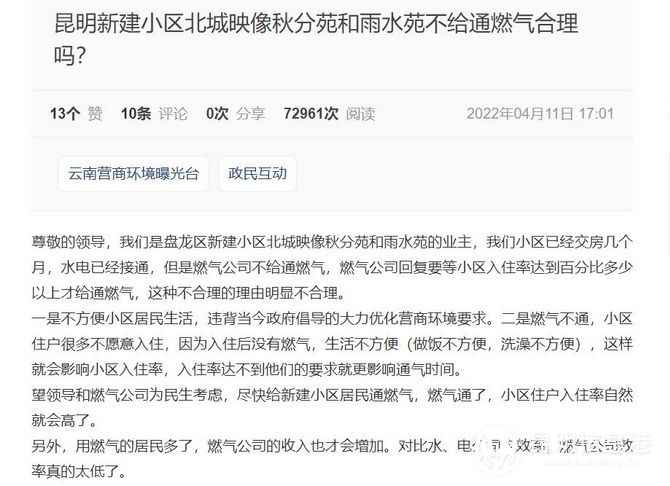 “沙堂”在貼文里說(shuō),自己是盤(pán)龍區(qū)新建小區(qū)北城映像(實(shí)際應(yīng)為北城映象)秋分苑和雨水苑(實(shí)際應(yīng)為谷雨苑)的業(yè)主,小區(qū)已經(jīng)交房幾個(gè)月,水電已經(jīng)接通,但是燃?xì)夤静唤o通燃?xì)?,燃?xì)夤净貜?fù)稱(chēng),要等小區(qū)入住率達(dá)到一定比例才給通氣。他認(rèn)為,這種理由明顯不合理。
