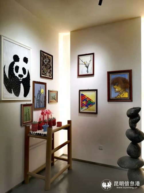 在垃圾分類體驗(yàn)館門口,利用廢鐵制作的鹿體造型雕塑“毛渣渣”正抬頭仰望嵌入房子的鐵樹。樹的斑駁、鹿的仰望,構(gòu)成一幅的渴望綠色、遙望家園的環(huán)保理念圖景。再往里走,跟垃圾分類、廢棄物回收再利用有關(guān)的科普知識(shí)展板遍布其中,一些用排水管、紅酒塞、瓶蓋等為原材料制作的小型畫框,也讓這些廢棄物重新呈現(xiàn)出特殊的美感。