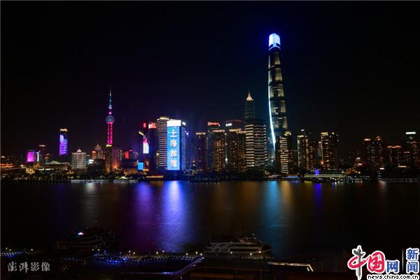 資料圖:2022年4月10日晚,上海外灘的大屏上顯示出“上海加油”的標語。中新社記者 田雨昊 攝