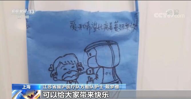 除了有心愿墻,方艙里的“大白”們還和患者們一起開展“套圈游戲”等趣味活動來幫助大家緩解放松心情?!?5后”護(hù)士戴夢雅和同事在艙內(nèi)工作時,發(fā)現(xiàn)“大白”防護(hù)服沒有口袋很不方便,她便就地取材自制了這種別具一格的小包,擅長畫畫的她還在上面繪制了各種可愛的漫畫造型。