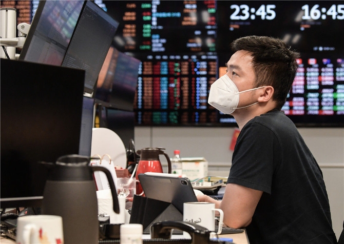4月14日晚上,工商銀行上海分行金融市場部商品交易員在崗位上工作。新華社記者 李賀 攝