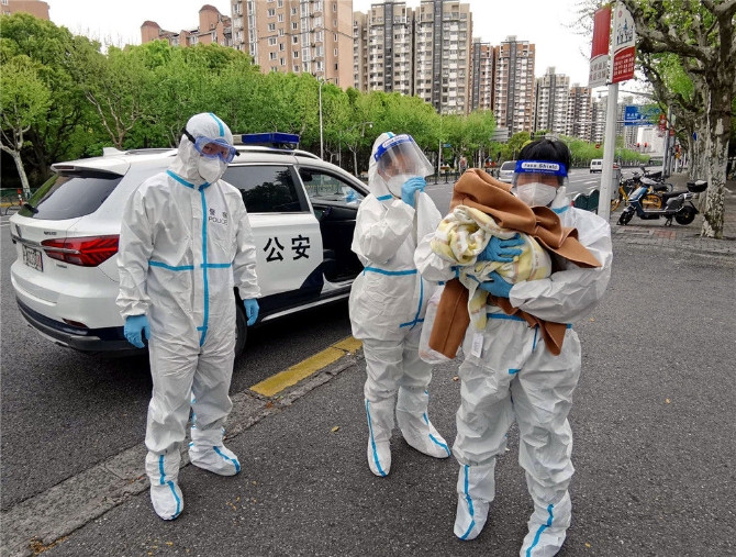 4月16日,上海市公安局經(jīng)偵總隊增援北蔡派出所民警護(hù)送患兒和家屬前往上海兒童醫(yī)學(xué)中心進(jìn)行救治。新華社發(fā)