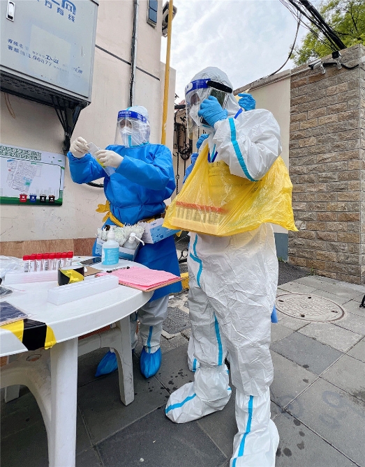 4月16日,長寧區(qū)周家橋街道周一居民區(qū)黨總支書記張振海(右)準(zhǔn)備陪同醫(yī)務(wù)人員進(jìn)行上門核酸檢測采樣。新華社發(fā)