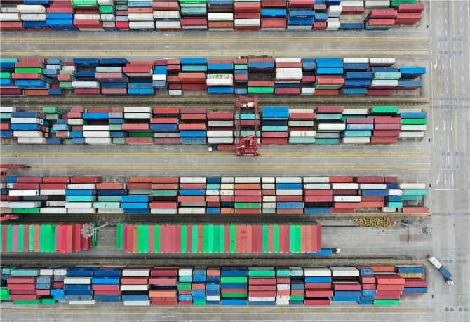 這是4月15日拍攝的上海洋山港集裝箱碼頭(無人機(jī)照片)。新華社記者 丁汀 攝