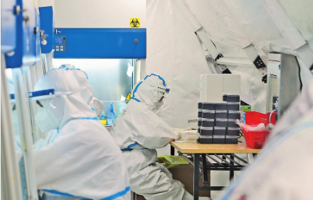 “隊(duì)員都是從各單位抽調(diào)的抗疫骨干。”楊祖順表示,在氣膜實(shí)驗(yàn)室里,執(zhí)行流水線操作,崗位職責(zé)至關(guān)重要。樣品接收組負(fù)責(zé)樣品整理,掃碼入庫,分發(fā)到另一個(gè)流水操作艙;試劑配制組負(fù)責(zé)檢測及配制;樣品制備組負(fù)責(zé)加樣、提??;產(chǎn)物擴(kuò)增和數(shù)據(jù)推送組負(fù)責(zé)上機(jī)檢測、數(shù)據(jù)分析、信息報(bào)送;感控組負(fù)責(zé)院感防控。