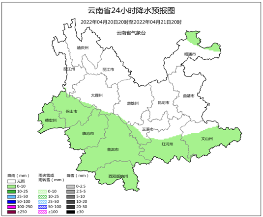 在谷雨節(jié)氣的頭幾天,云南的天氣沒那么“應景”。從4月21日開始,影響云南的降水系統(tǒng)趨于減弱,大部地區(qū)雨過天晴,氣溫也開始穩(wěn)步攀升。云南省氣象臺預計,21日,昆明主城區(qū)多云間晴,氣溫12~23℃。全省范圍內,昭通北部、保山、德宏、臨滄、普洱、西雙版納、玉溪西部、紅河南部、文山南部多云有陣雨局部中雨,其他地區(qū)晴間多云。