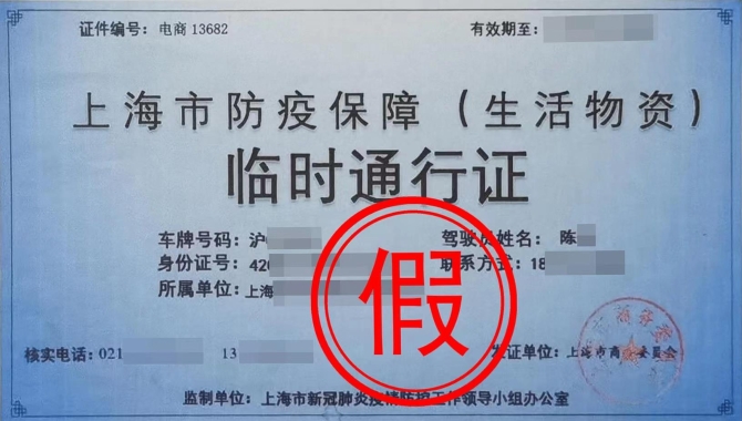 近日,上海金山警方根據(jù)線索破獲一起偽造防疫車輛通行證案件,抓獲犯罪嫌疑人3名,繳獲假冒《上海市防疫保障(生活物資)臨時(shí)通行證》11張。