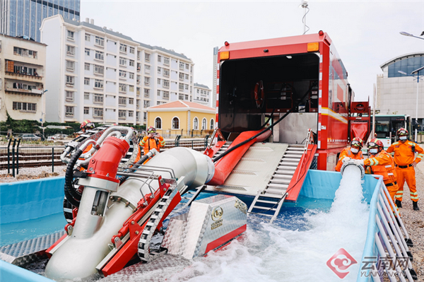 演練主要采取現(xiàn)場演練、直播、錄播和裝備展示的方式進行;現(xiàn)場模擬受強降雨影響,昆明市氣象臺發(fā)布暴雨橙色預(yù)警。主城區(qū)河道水位上漲,部分河道漫堤,地鐵運營線路站口發(fā)生雨水倒灌,積水淹過地鐵線路軌面,運行中的列車被逼停,乘客被困車廂內(nèi);在此極端暴雨天氣下,地鐵火車北站周邊道路淹水并倒灌入車站G出入口,淹沒地鐵線路軌面,運行中的列車被逼停車,有乘客被困車廂內(nèi);隨即啟動應(yīng)急預(yù)案,開展救援工作。