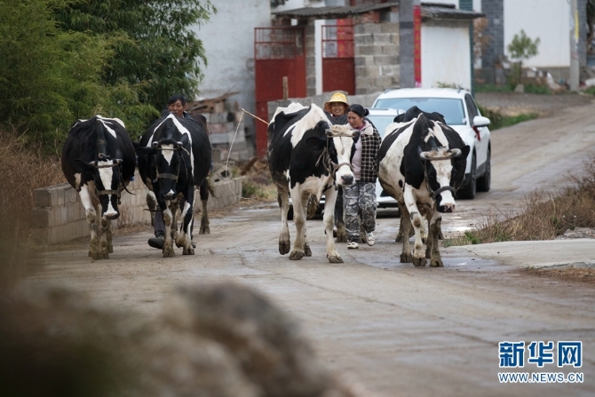 洱源縣三營鎮(zhèn)永樂村委會,村民們趕著奶牛到擠奶站進行集中擠奶(攝于4月1日)。(新華網(wǎng) 趙普凡 攝)