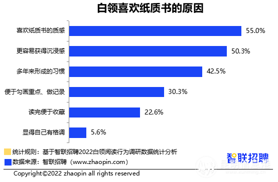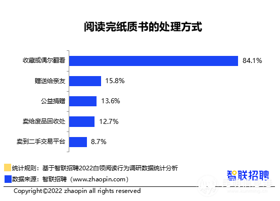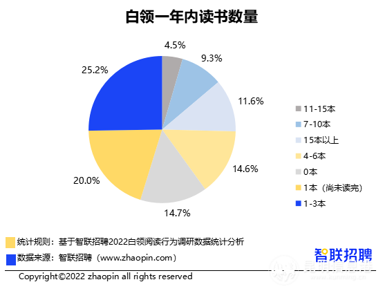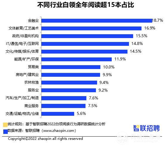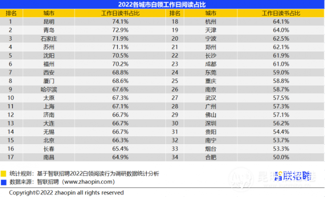 智聯(lián)招聘近日發(fā)布《2022白領(lǐng)閱讀行為調(diào)研報告》,其中指出,超過三成白領(lǐng)全年讀書不足一本,超過六成白領(lǐng)會在工作日抽時間讀書,昆明、青島、石家莊為全國三大“愛讀書城市”。