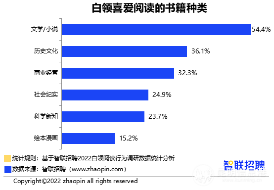 調(diào)查顯示,文學(xué)/小說最受白領(lǐng)歡迎,54.4%的受訪者表示喜歡閱讀這類書籍。排在第二、第三的是歷史文化、商業(yè)經(jīng)營,表示喜歡閱讀此類書籍的受訪者分別占比36.1%、32.3%。相比之下,中高層領(lǐng)導(dǎo)更青睞商業(yè)經(jīng)營類書籍,58.8%的受訪者選擇此選項。