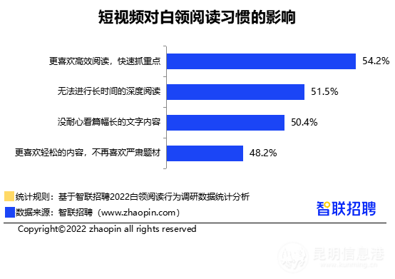 至于短視頻對閱讀習(xí)慣的具體影響,主要體現(xiàn)在閱讀效率、專注度和題材偏好三方面。其中,選擇“更喜歡高效閱讀,快速抓重點”的白領(lǐng)占比最高,達(dá)54.2%;分別有51.5%和50.4%的白領(lǐng)認(rèn)為,“無法進(jìn)行長時間閱讀”和“沒耐心看完篇幅長的文字內(nèi)容”;48.2%的白領(lǐng)表示“更喜歡輕松內(nèi)容,不再喜歡嚴(yán)肅題材”。