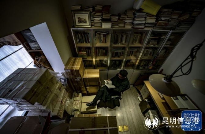 ↑周重林在他的藏書間看書(4月21日攝)。
