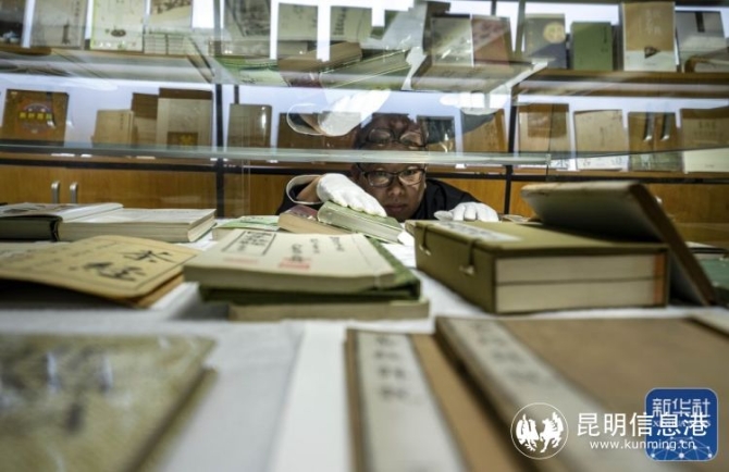 ↑周重林在整理書店里展出的茶書(4月21日攝)。