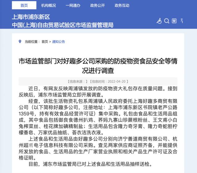 浦東市場監(jiān)管部門發(fā)布對周浦鎮(zhèn)防疫物資大禮包的調(diào)查情況。(浦東市場監(jiān)管局網(wǎng)站截圖)