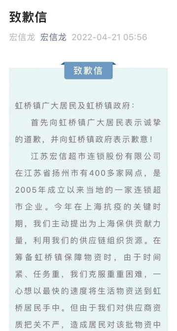 江蘇宏信超市連鎖股份有限公司在其官方公眾號發(fā)布的致歉信